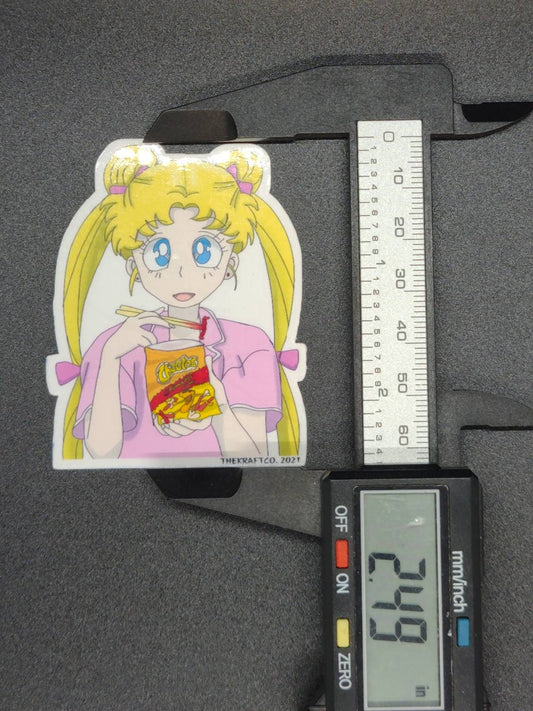 Sailor moon eating hot Cheetos with chopsticks laminated sticker.