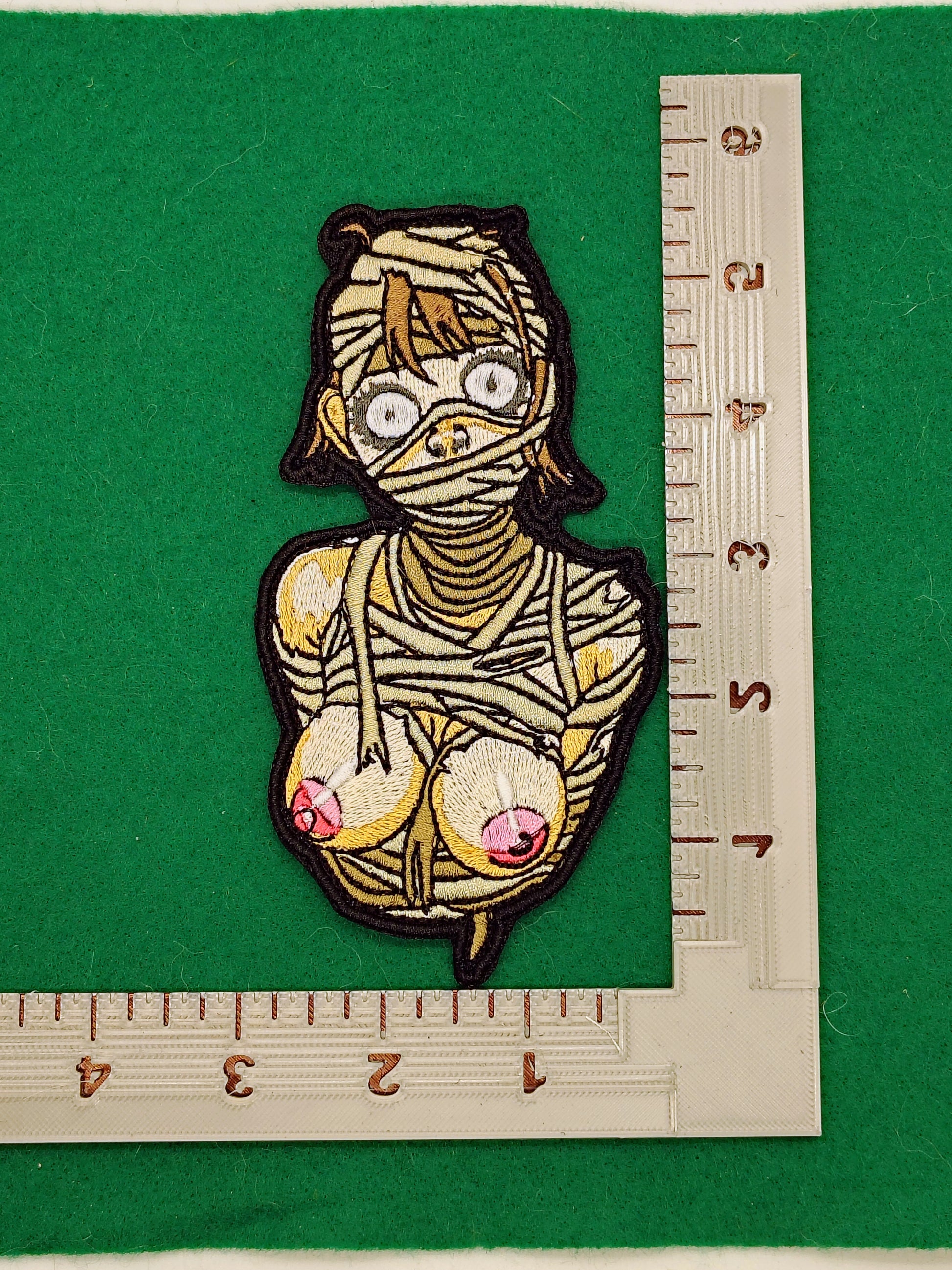 All wrapped up and ready for spooky season (or any season, really). This embroidered patch features our wide-eyed waifu completely tangled in mummy wraps, with a mix of creepy-cute and cheeky fan-service vibes. Perfect for horror lovers, anime fans, and anyone who likes their waifus with a little extra personality.